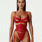 Design: A stunning three-piece set crafted entirely from vibrant red lace.
