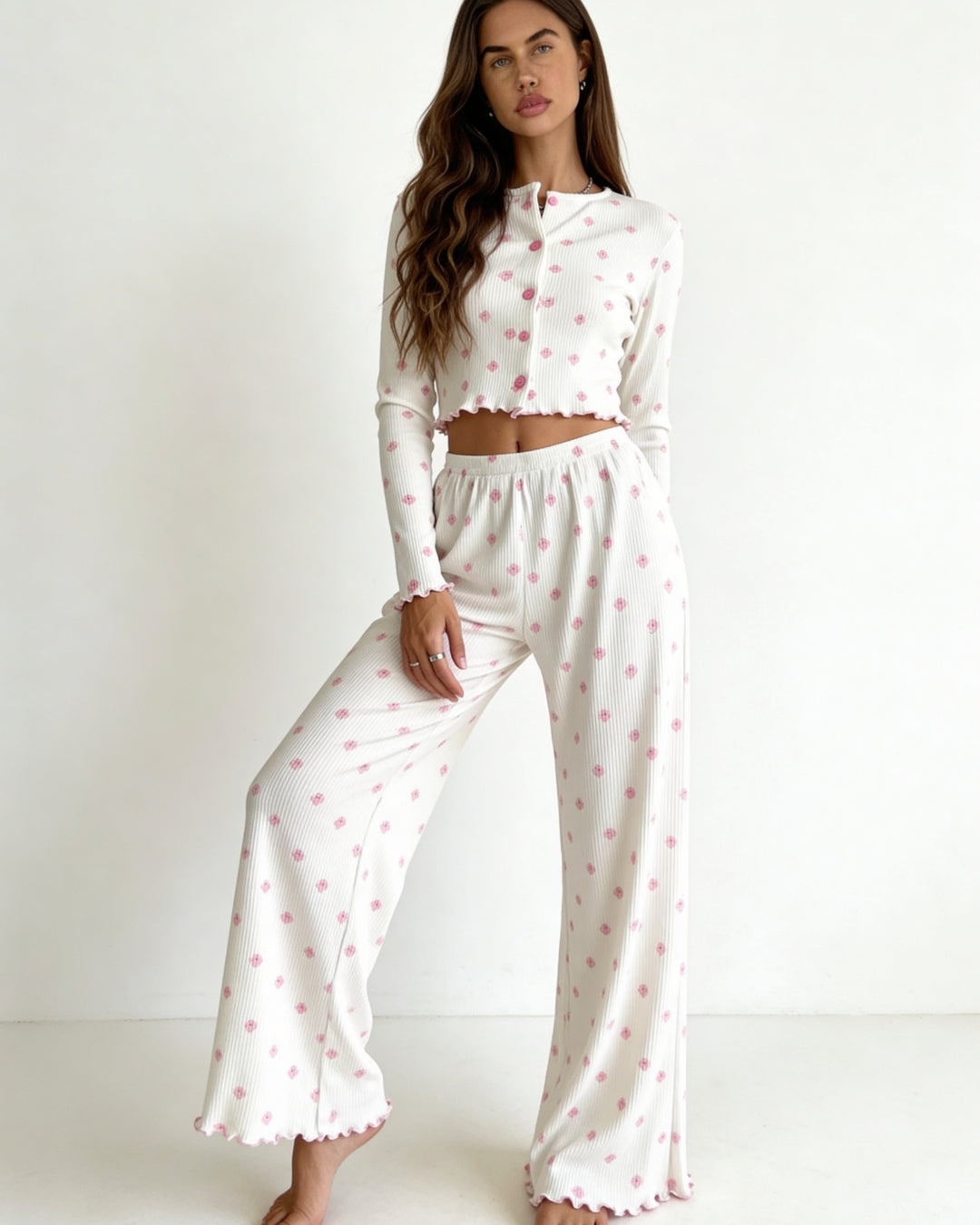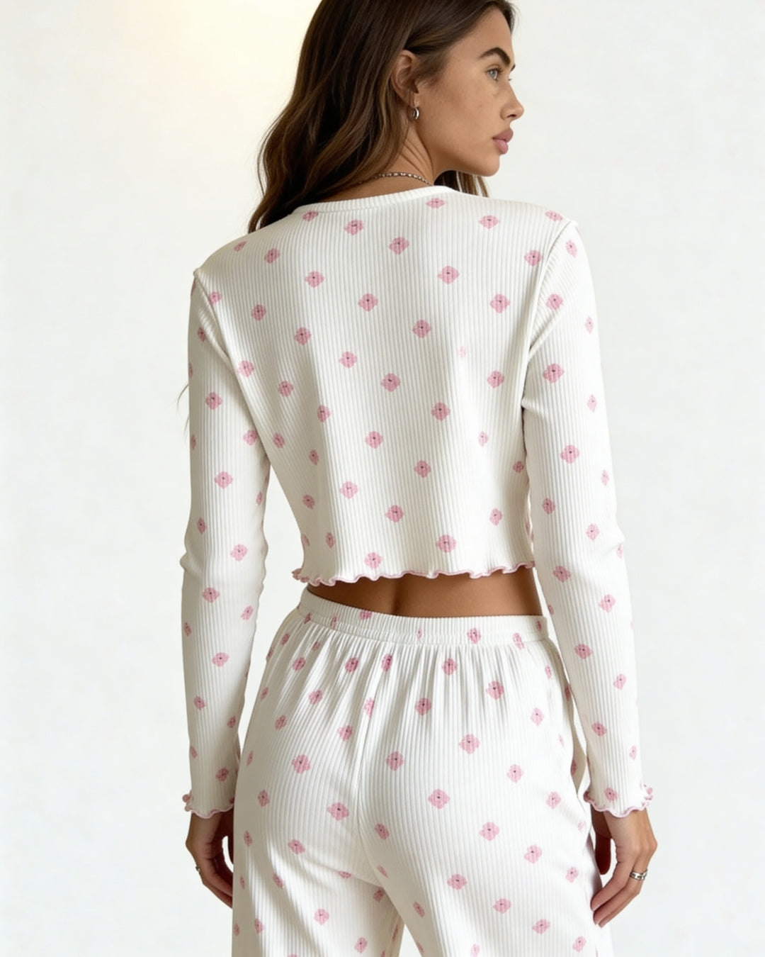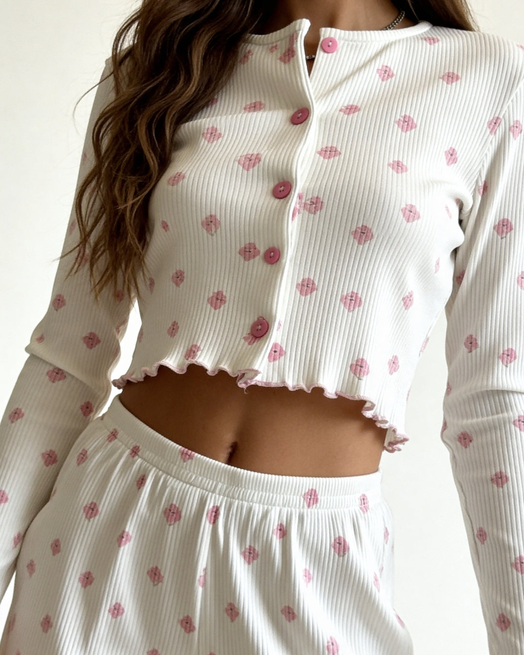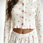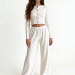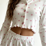 Embrace the gentle beauty of spring with the Dahlia Pajama Set, a dreamy blend of comfort and femininity. Featuring a delicate pink floral print on fine ivory ribbed fabric, this set brings a soft, romantic charm to your everyday loungewear.