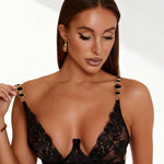 Turn up the heat with Fiona's Lingerie Set! This breathtaking lingerie set features elegant floral embroidery on soft, supportive mesh. It's designed to be irresistible, with delicate decorative gems sparkling on the underwired, unpadded bra and thong.