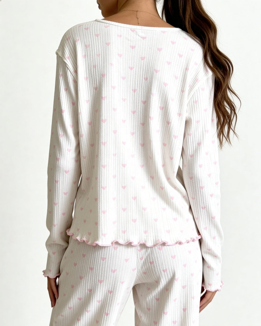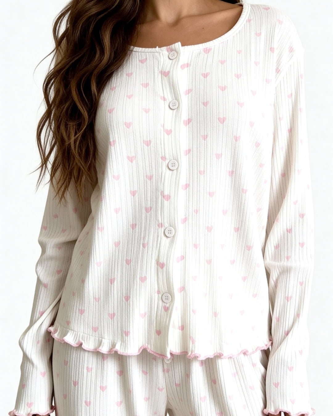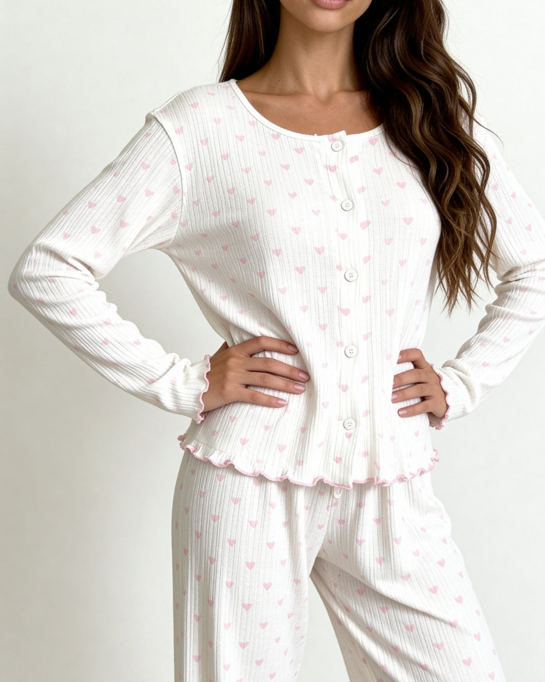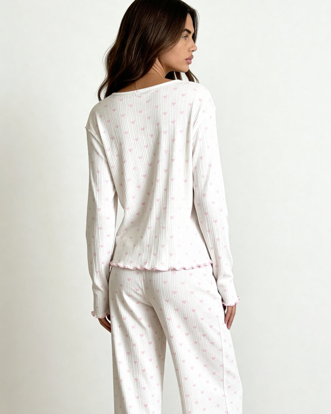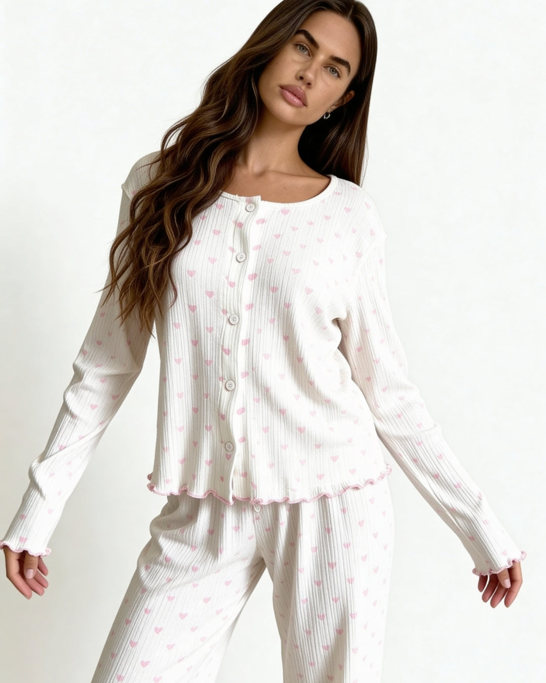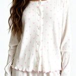 Wrap yourself in softness with the Neya's Pajama Set, a sweet and romantic essential designed for dreamy nights and relaxed mornings. Crafted from soft off-white ribbed jersey and adorned with delicate pink heart prints, this charming set brings a playful yet elegant touch to your loungewear collection.